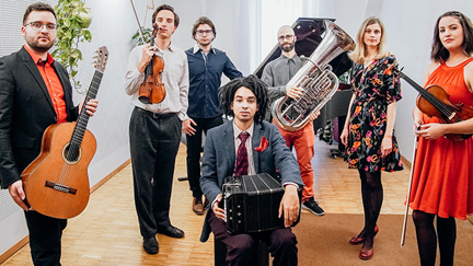 Im Buenos Aires des frühen 20. Jahrhundert füllten große Tangoorchester regelmäßig die Tanz- und Konzertsäle. Viele Jahre später, am anderen Ende der Welt, schließt Bandouba, eine junge Grazer Formation, an diese umfassende Musiktradition an. Die Band spielt traditionellen Tango, Klassiker aus der „goldenen Zeit des Tango“ sowie zeitgenössische Stücke von argentinischen Komponist*innen und aus eigener Feder. Wir erleben dabei Melodien, Rhythmen und Texte, die zum Nachdenken anregen, zum Tanzen bewegen, Herzen brechen und Hoffnung machen. Mit ihrer einzigartigen Besetzung und innovativen Arrangements erzeugen Banouba ein Klangbild, welches auch dem individualistischen Ansatz der damaligen Tangueros treu bleibt: Nicht die bloße Reproduktion ist es, die den Tango am Leben erhält, sondern die immerwährende Neuerfindung.